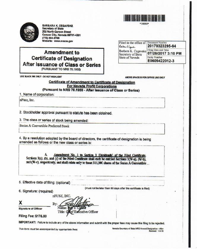 IN WITNESS WHEREOF, the Corporation has caused this Amendment No. 1 to Certificate of Designations of Series A Convertible Preferred Stock of nFüsz, Inc. to be signed by its Chief Executive Officer on this 28th day of July, 2017.