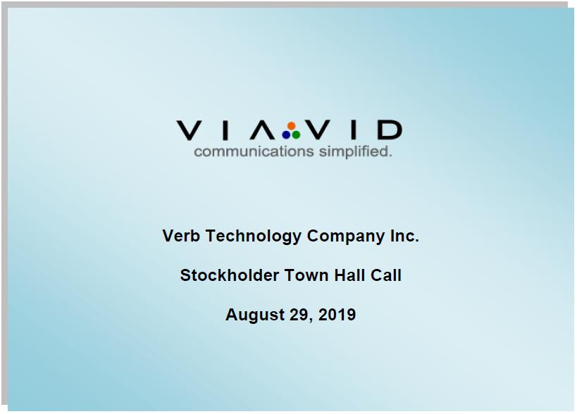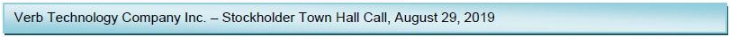 Good afternoon, and welcome to the Verb Technology Company’s Stockholder Town Hall Conference Call. The purpose of this call is to address questions concerning Verb’s second quarter 2019 Form 10-Q, filed on August 14. As discussed on the August 14 conference call, the late end-of-day filing on that date allowed investors little time to read the filing before the start of the Management call. Accordingly, Verb Management offered to host this additional call to ensure that investors have an adequate opportunity to read the Form 10-Q before formulating questions. In order to maximize the number of questions to be answered during the one-hour allotted time, as well as to ensure that only questions that are relevant and did not call for the disclosure of material nonpublic information, investors were asked to submit their questions in writing by Friday, August 23 to allow counsel to review the questions for compliance purposes. All questions that met the foregoing criteria are intended to be addressed in today’s call, as time permits.