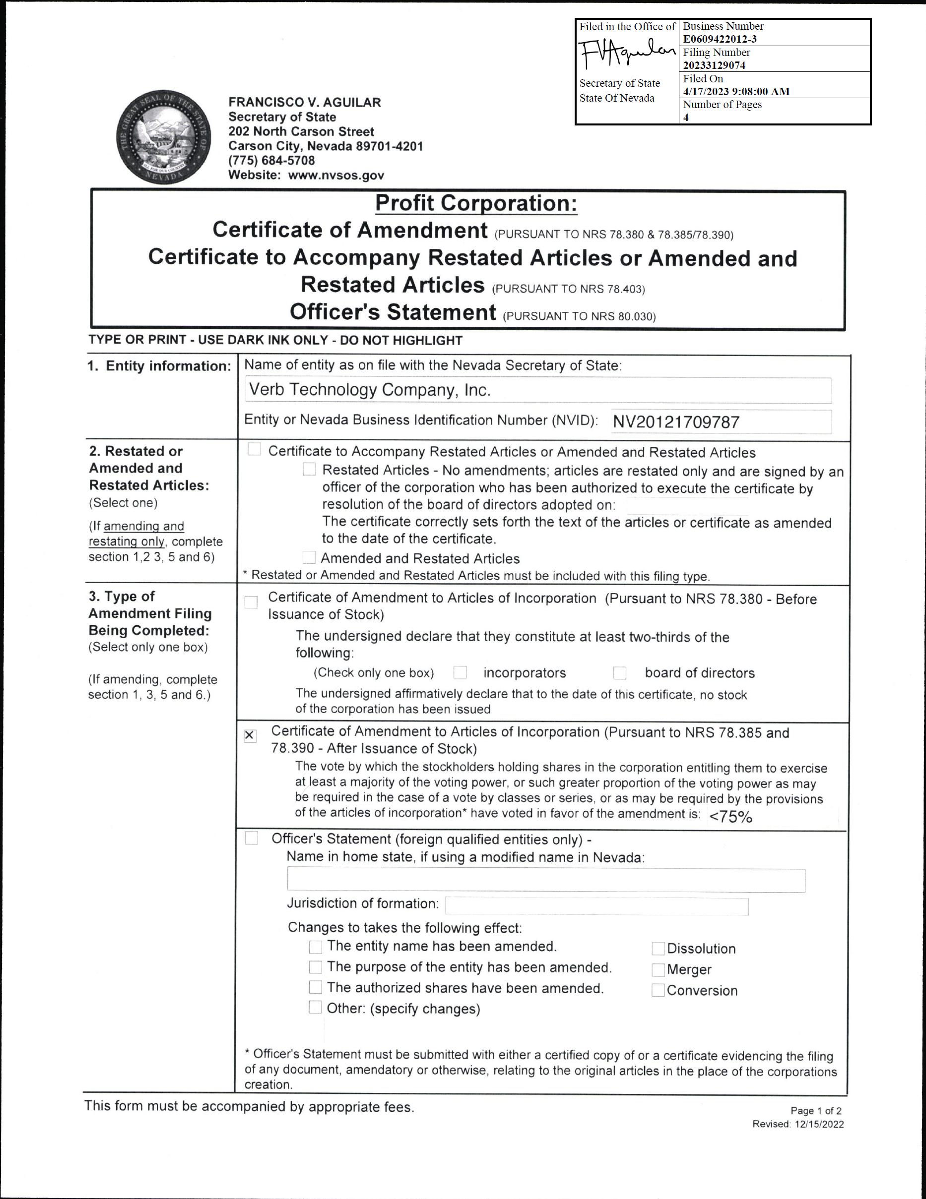 FIRST: The name of the Corporation is Verb Technology Company, Inc. The Corporation’s articles of incorporation was filed with the Secretary of State of the State of Nevada on November 27, 2012 (the “Articles of Incorporation”).