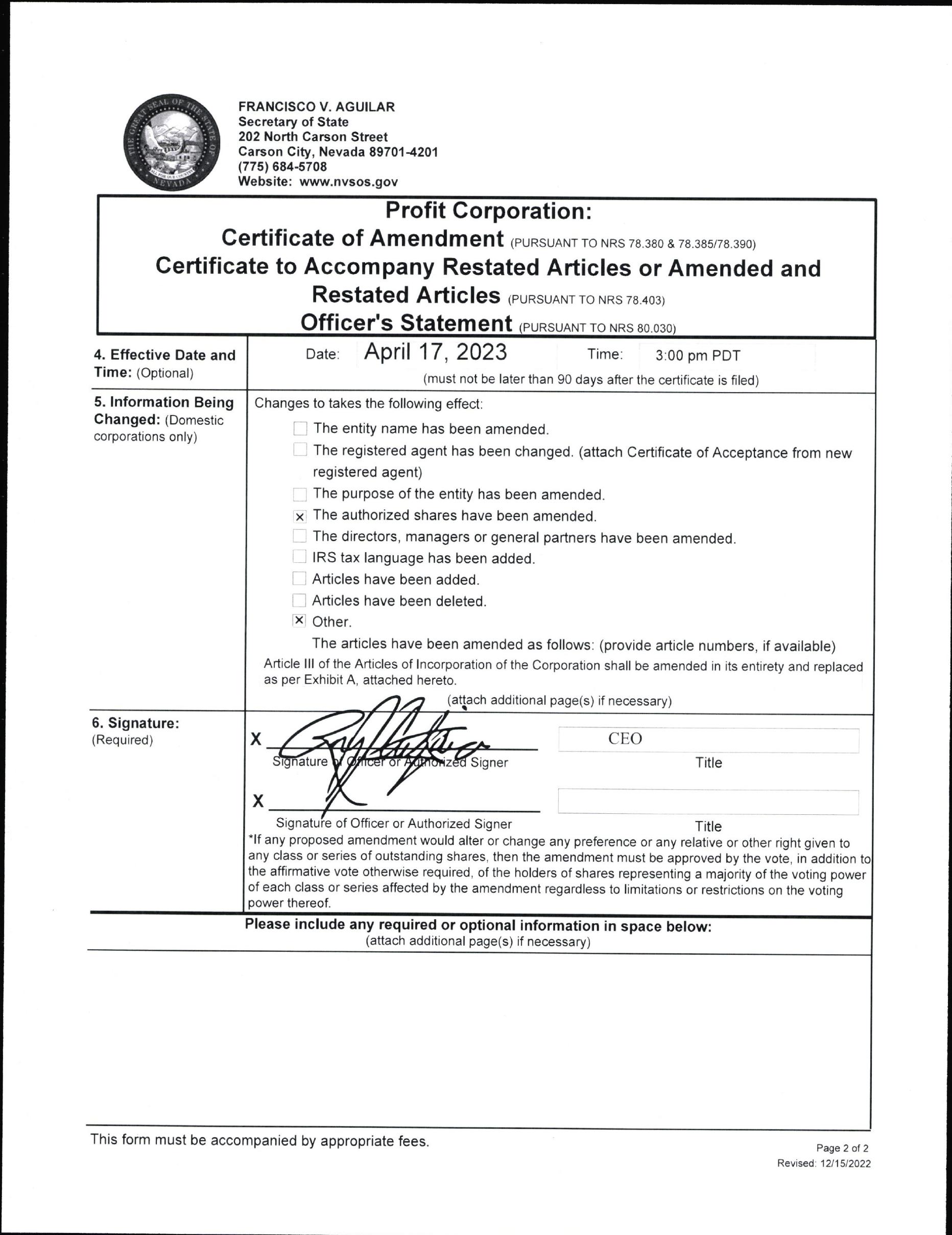 THIRD: This Certificate of Amendment shall be effective as of 3:00 p.m., Pacific Daylight Time on April 17th , 2023.